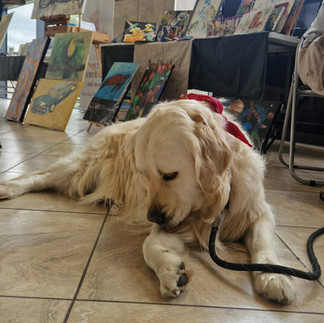 Step into Pickles’ world of whimsy and imagination, where every painting tells a “tail” of adventure and canine creativity — leaving tails wagging and hearts melting. Pickles is a Golden Retriever therapy dog and our very own Pawcasso, proving that art truly has no limits… or species.
